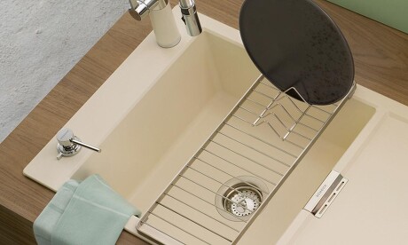 Einige moderne Spülbecken kommen dafür mit drei Bohrlöchern aus der Fertigung: Ein Loch für die Armatur, eines für die Exzenter-Steuerung und ein drittes Loch für den Seifenspender. Vom Spülenhersteller Schock gibt es sogar einen Einbau-Spülmittelspender, der beides kann: den Abfluss verschließen und Spülmittel spenden. Dafür ist unten am Gehäuse ein kleiner Hebel angebracht. Das Spülmittel kommt wie gewohnt per Druck von oben.