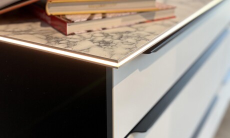 Auch bei der Materialwahl eröffnet sich ein breites Spektrum. Ob Compact, Keramik oder Quarzstein, die LED-Kante von AKP lässt sich individuell kombinieren und sorgt dafür, dass Licht und Oberfläche harmonisch miteinander verschmelzen. Struktur, Tiefe und Materialwirkung kommen so besonders wirkungsvoll zur Geltung.