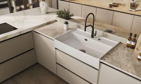 Ob moderner Country-Look, klassische Landhausküche oder urbanes Loftambiente – die neue KENTRO 90 von Systemceram setzt in jeder Umgebung ein ausdrucksstarkes Statement. Mit einer Gesamtbreite von 90 cm und einem großzügigen Beckenmaß von 86 x 41,5 cm bietet sie besonders viel Platz und Komfort im Küchenalltag. Damit eignet sie sich nicht nur für ambitionierte Hobbyköche, sondern auch als semi-professionelles Vorbereitungs- und Spülcenter.