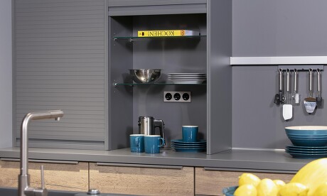 Zugegeben: So richtig neu sind sie defacto nicht, aber derzeit halten sie in neuer Bauform verstärkt Einzug in moderne Küchen. Die Rede ist von Rolladenschränken, und zwar solchen, die mit geringer Tiefe als Aufsatzschränke auf der Arbeitsplatte eingebaut werden.