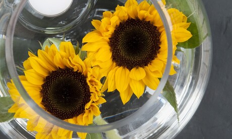 Sonnenblumen sind ein echter Hingucker. Haben Sie auch welche auf dem Balkon oder im Garten? Falls Wind oder Gewicht ihren langen Stiel abknicken sollte, retten Sie die Blüten doch in einem Goldfischglas oder einer schönen Schale. Füllen Sie Glas oder Schale dazu einfach zur Hälfte mit Wasser, legen Sie einige Kieselsteine hinein und lassen die Sonnenblumen-Blüten darüber treiben. Schwimmkerzen dazu, fertig. Das sieht wunderschön aus und ist auch dann eine Lösung, wenn für mitgebrachte Sonnenblumen keine ausreichend große Vase vorhanden ist!